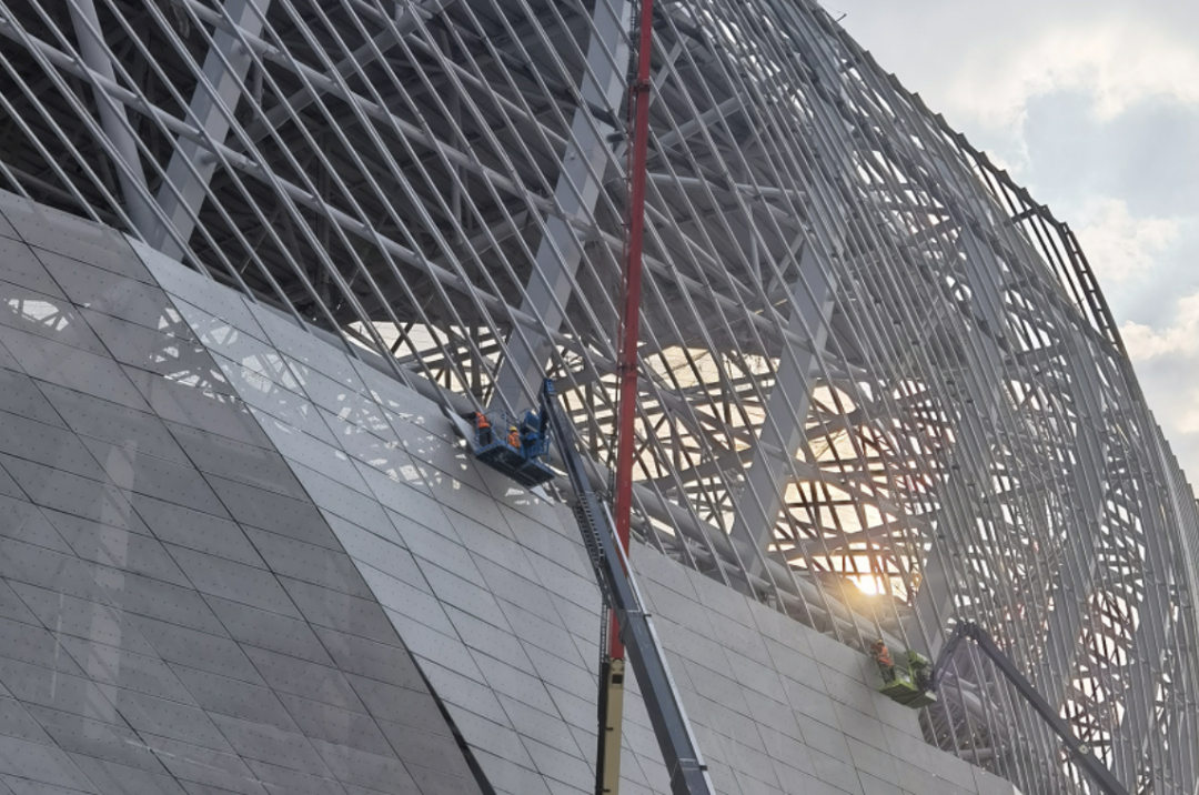 2020年4月24日進場施工,8月底完成場平,9月1日開始基坑開挖,10月1日開始基礎設施施工,12月30日完成球場地下室結(jié)構封頂。2021年4月主體結(jié)構封頂,8月鋼結(jié)構吊裝完成,11月屋面斷水。目前龍興足球場已全面進入外立面施工和室內(nèi)精裝修階段,進度領跑“亞洲杯”6個新建場館。