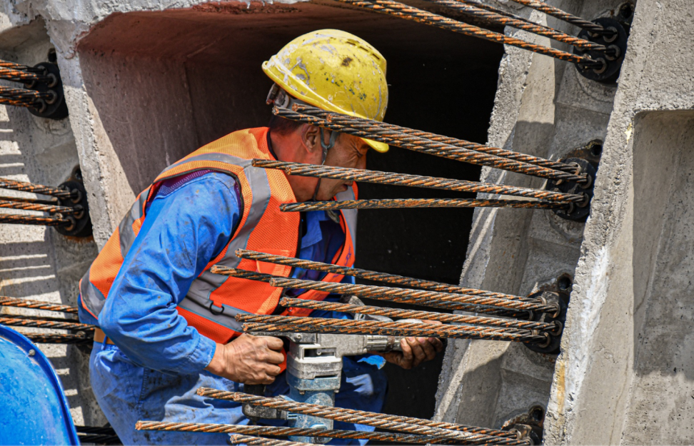 工人在進(jìn)行鑿預(yù)埋鋼筋作業(yè)
