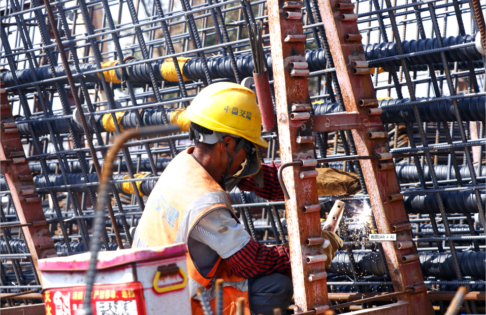 梁場工人在進(jìn)行鋼筋電焊作業(yè)